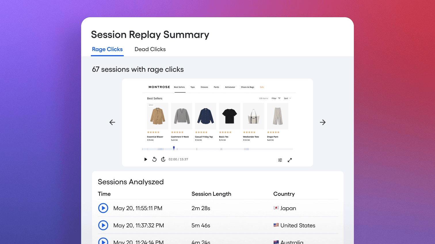 Easily spot friction points and dropoff moments in your product. Agents watch user sessions at scale to present curated insights and playlists that help you diagnose and fix common problems.