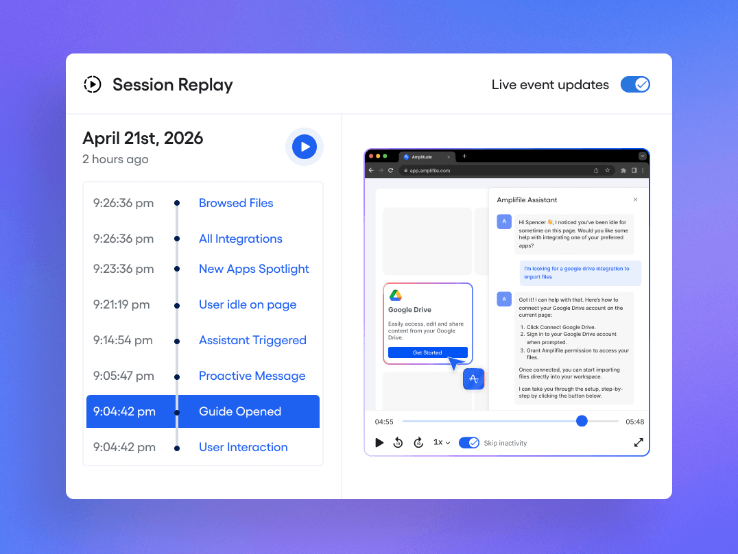 AI Assistant is built natively on Amplitude's full platform, so every tool you already use makes it smarter. Amplitude Analytics powers the behavioral intelligence behind every interaction. Guides and Surveys deliver contextual walkthroughs in the moments that matter. Session Replay captures what brought a user to ask and what they did after, giving real support specialists a complete case file at handoff. And AI Feedback turns every conversation into a continuous, actionable stream of product intelligence.