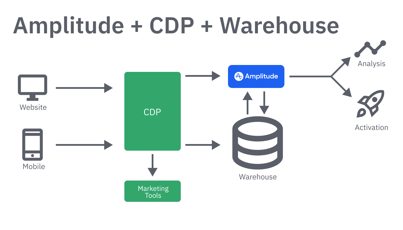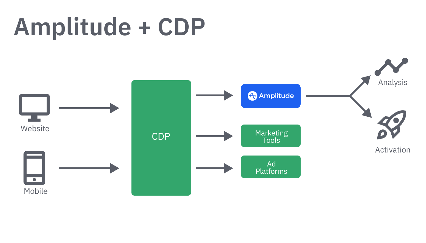 Here, a CDP is the primary collection and routing layer, and Amplitude is a downstream analytics and activation destination.