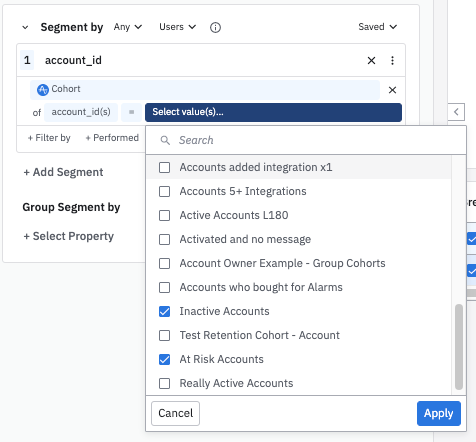 グループコホートをチャートに適用する場合、[+ Filter by] > [コホート]の順にクリックしてグループを追加します。 次に、リストからグループ名を選択します。