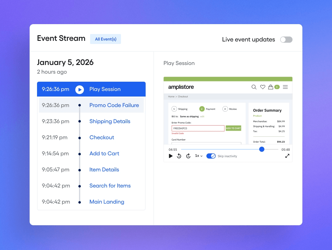 Combina analítica en tiempo real con reproducciones visuales para obtener una visión completa del comportamiento de los usuarios. Identifica fricciones, optimiza experiencias e impulsa el crecimiento, sin tener que preguntarte qué funciona y qué no.