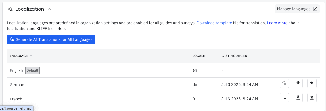 Why: Customers with applications that support different languages want to display guides and surveys in the correct language. If you support multiple languages, keeping them up to date becomes tedious. We already offer an API that you could use to automate this yourself. But, not everyone has the engineering capacity to do that.