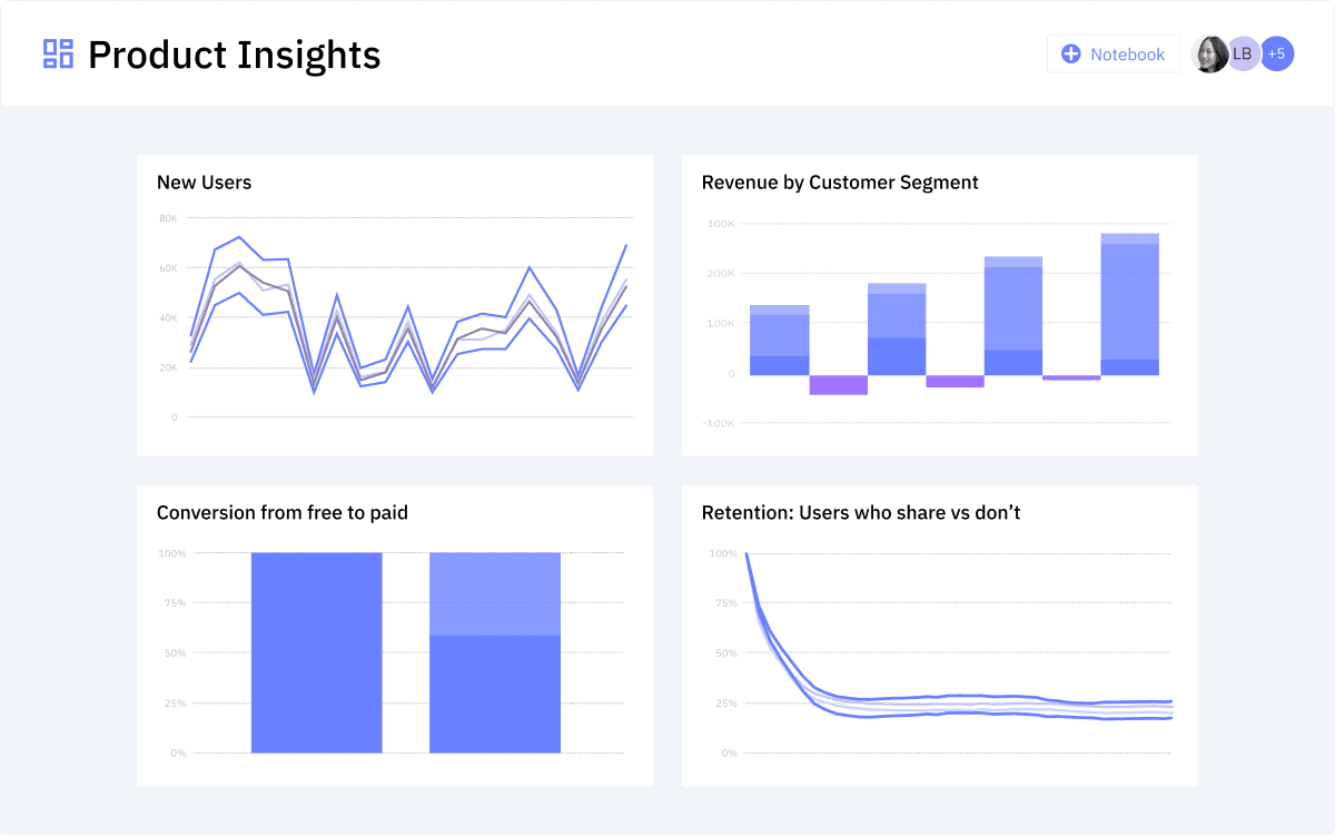 - Collaborez sur vos insights et vos rapports avec des tableaux de bord et des blocs-notes.