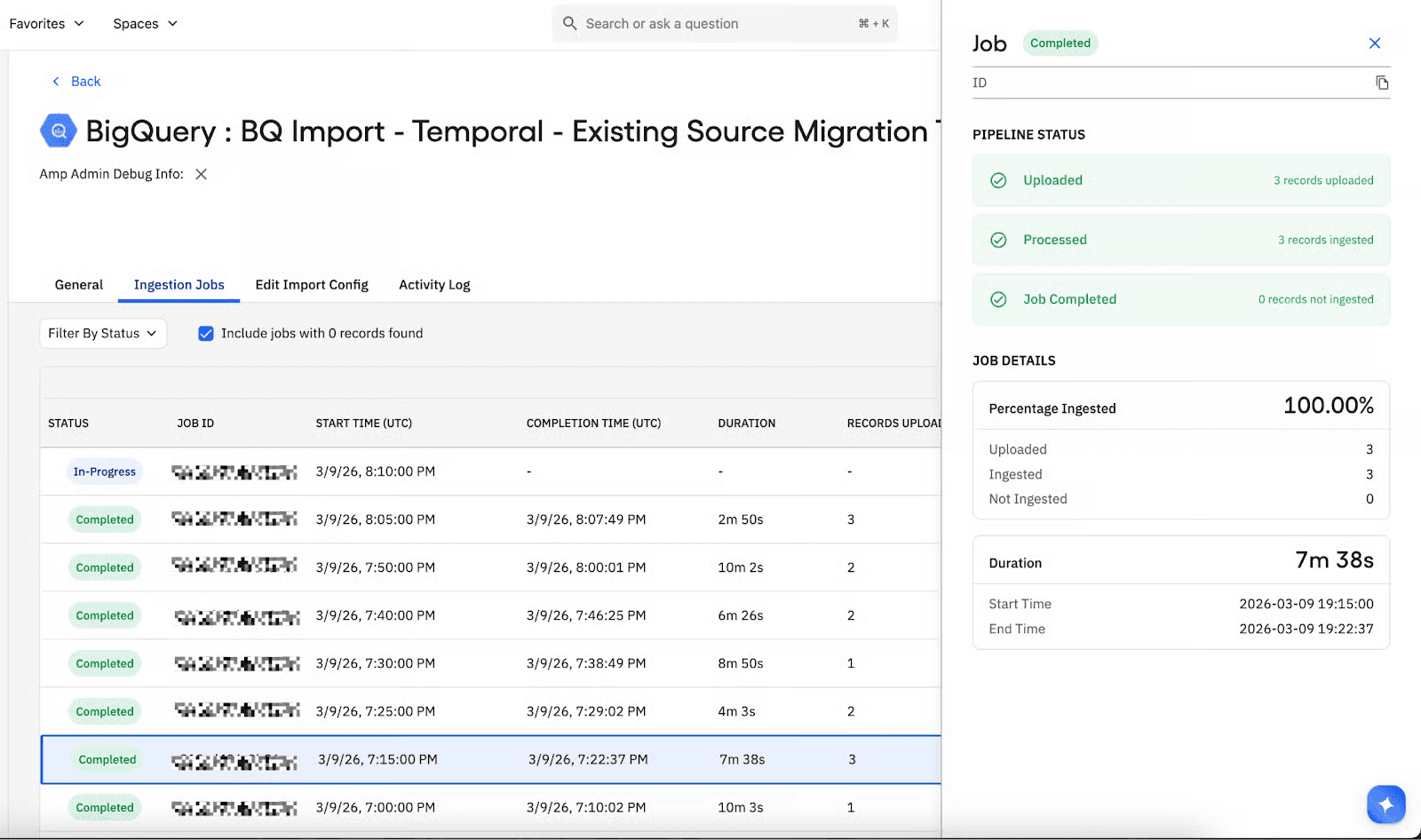 Why: The Job Details Drawer unlocks deeper insights into ingestion health, enabling customers to self-serve debug data quality issues (e.g., seeing exactly how many records were deduplicated or deemed non-compliant) without needing to file a support ticket.