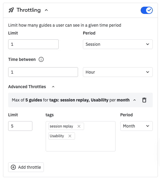 Description: Previously, you could have a single global limit for how many guides or surveys could be shown to a user per day/week/month/session. Now, you can also configure how much time has to pass before a new guide is shown. Additionally, you can add tag-based throttles that limit the number of guides or surveys with a specific tag that can be displayed within a specified period.