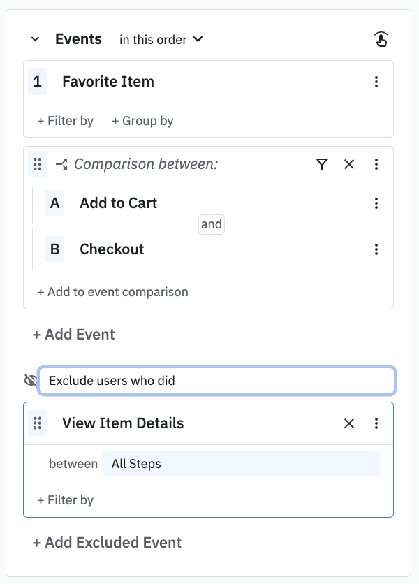 To exclude users from your funnel who trigger specific events between steps of your funnel, click + Exclude users who did and select the exclusion event from the drop-down list. You can apply the exclusion between all steps in the funnel, or between two specific steps. For any-order funnels, users exclude themselves if they fire the exclusion event between any of the funnel steps.