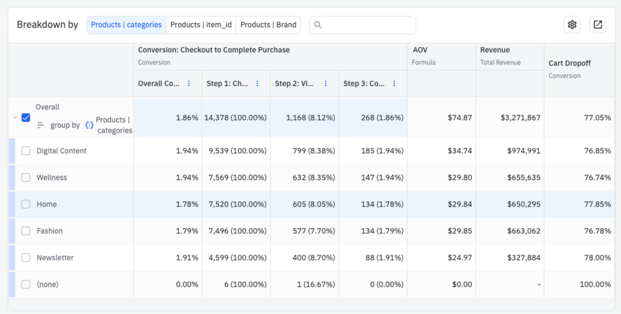 Unlike the Conversion hub, which focuses on overall funnel performance, the Purchase by item hub adds ecommerce-specific granularity. You can: