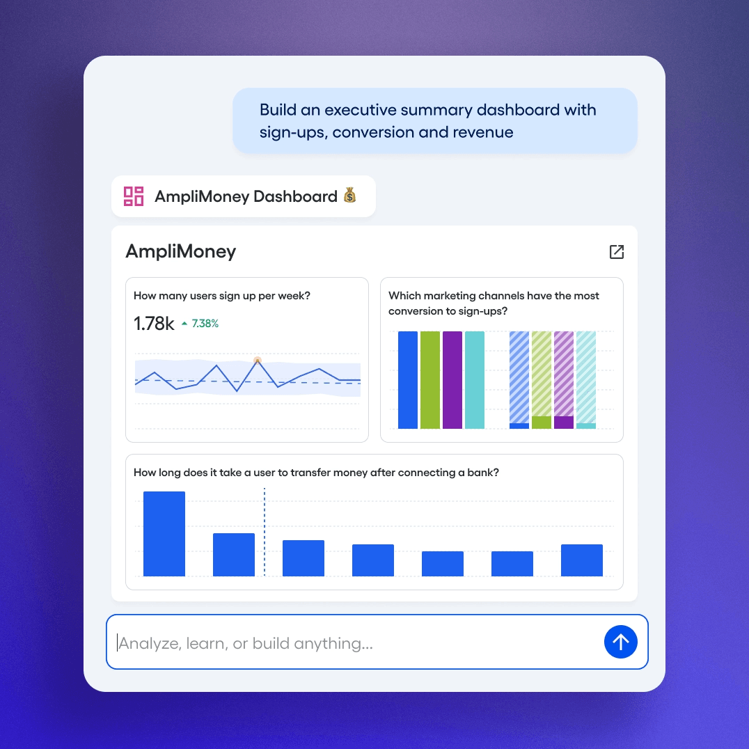에이전트를 통해 Amplitude 플랫폼의 모든 기능을 활용할 수 있습니다. 에이전트를 사용하면 누구나 자연어를 사용하여 분석 결과를 실행으로 옮길 수 있습니다.