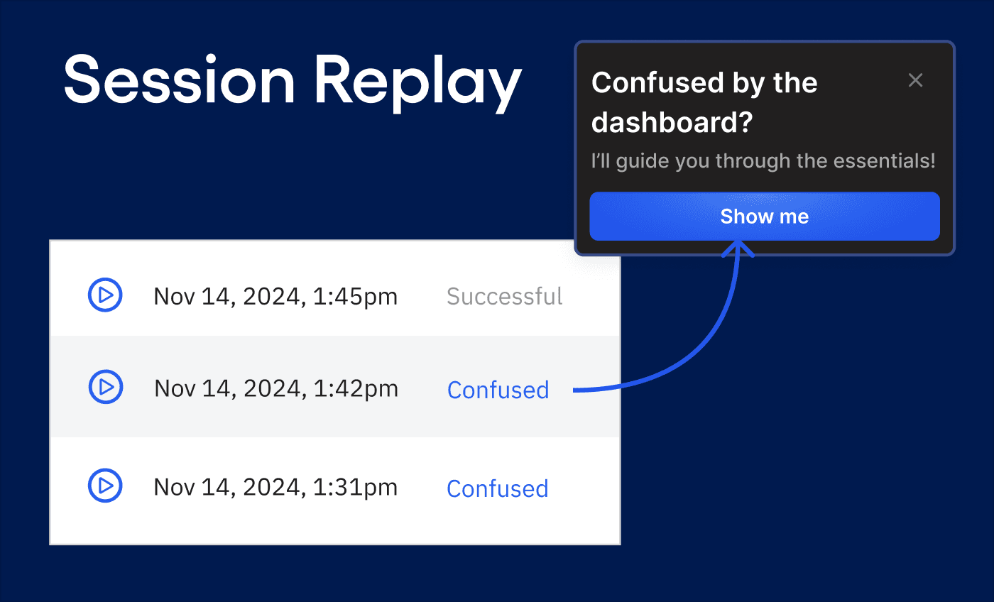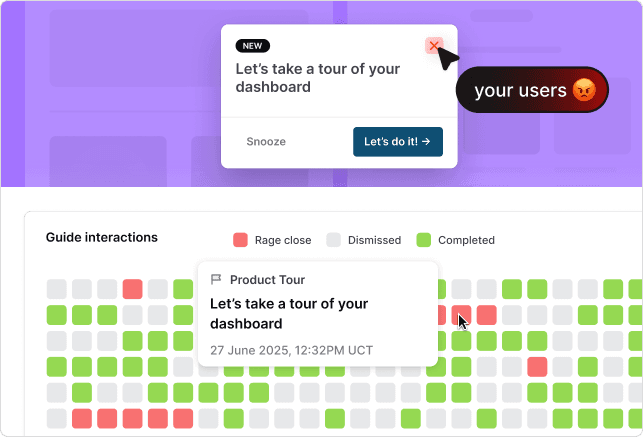 내장된 가드레일과 우선순위 지정 논리를 사용하여 적시에 가이드와 설문조사를 생성함으로써, 사용자가 연속적인 팝업으로 인해 부담을 느끼지 않도록 합니다.