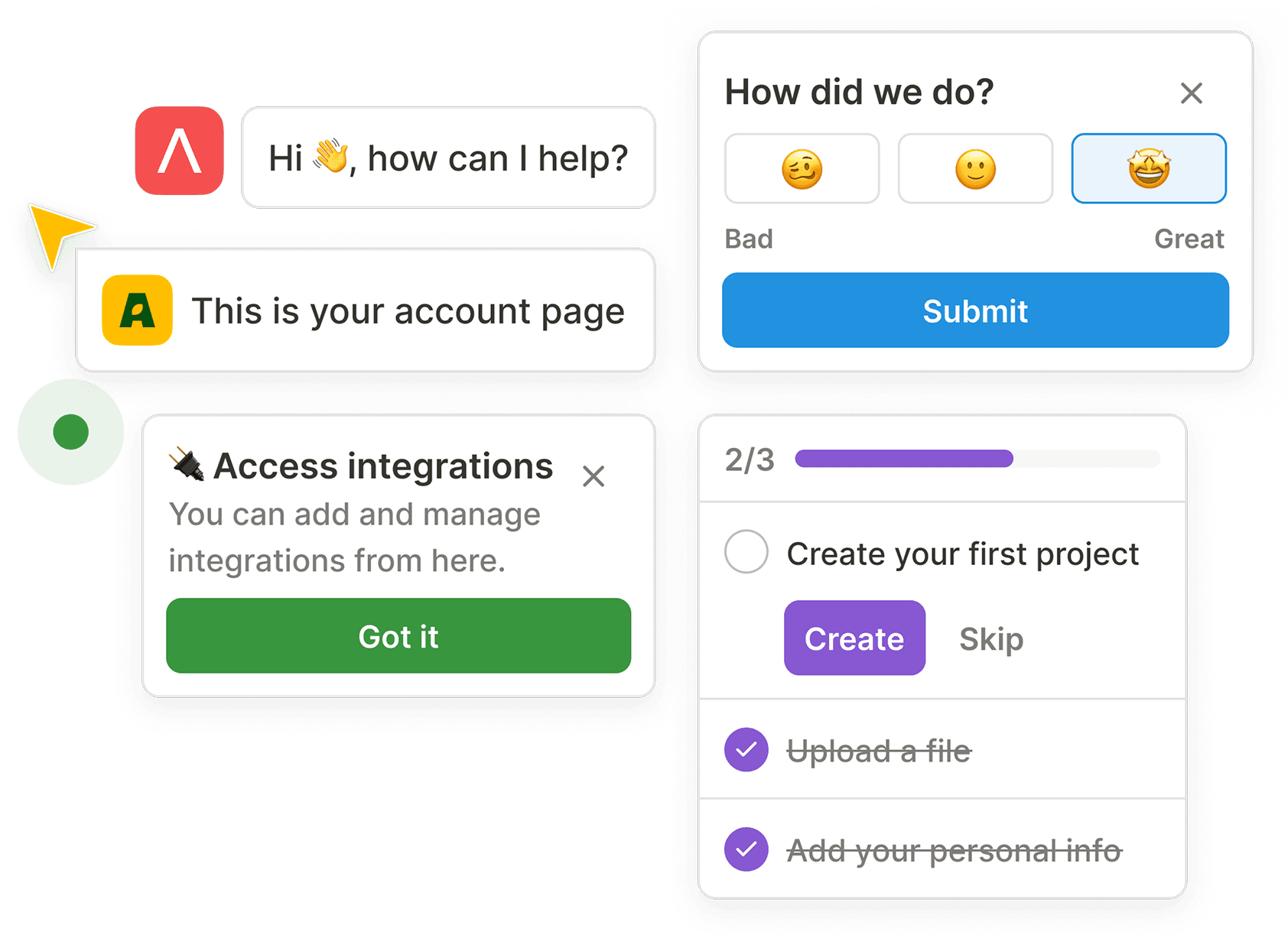 사용자는 부담스러운 영업 사원이 아니라, 제품이나 웹사이트를 탐색하는 데 도움을 주는 똑똑한 친구 옆에 앉아 있는 것처럼 느껴야 합니다. 가이드 및 설문조사에서는 정확한 행동 기반 타겟팅과 구성 가능한 가드레일을 사용하여 사용자가 가치를 창출할 수 있도록 합니다.